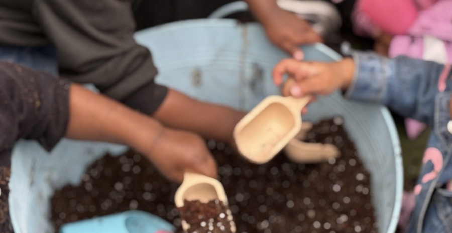 During our unit focused on seeds and soil, children scooped, sifted, and smelled garden soil and planted seeds in peat pellets. They read the book, If You Plant a Seed, and explored herbs like lemon balm, mint, and basil. One child dove into the garden sensory bin with glee, shouting, “Garden!”