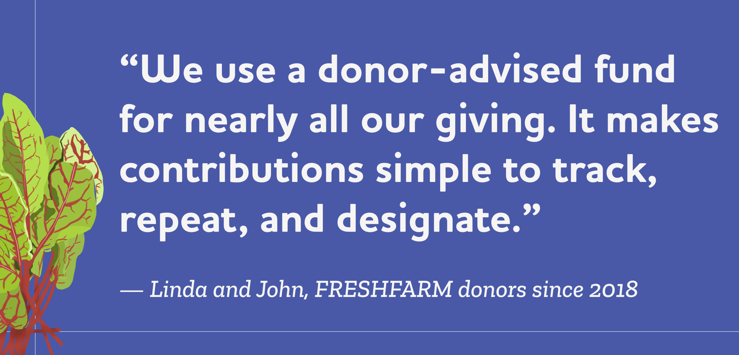 A donor-advised fund or DAF is a simple, flexible, and tax-efficient way to support the causes you care about. Contributions to a DAF may qualify for a charitable tax deduction while retaining the ability to recommend grants to FRESHFARM. DAFs make philanthropy accessible—donors don’t need to be wealthy to open a DAF and give in a meaningful way.